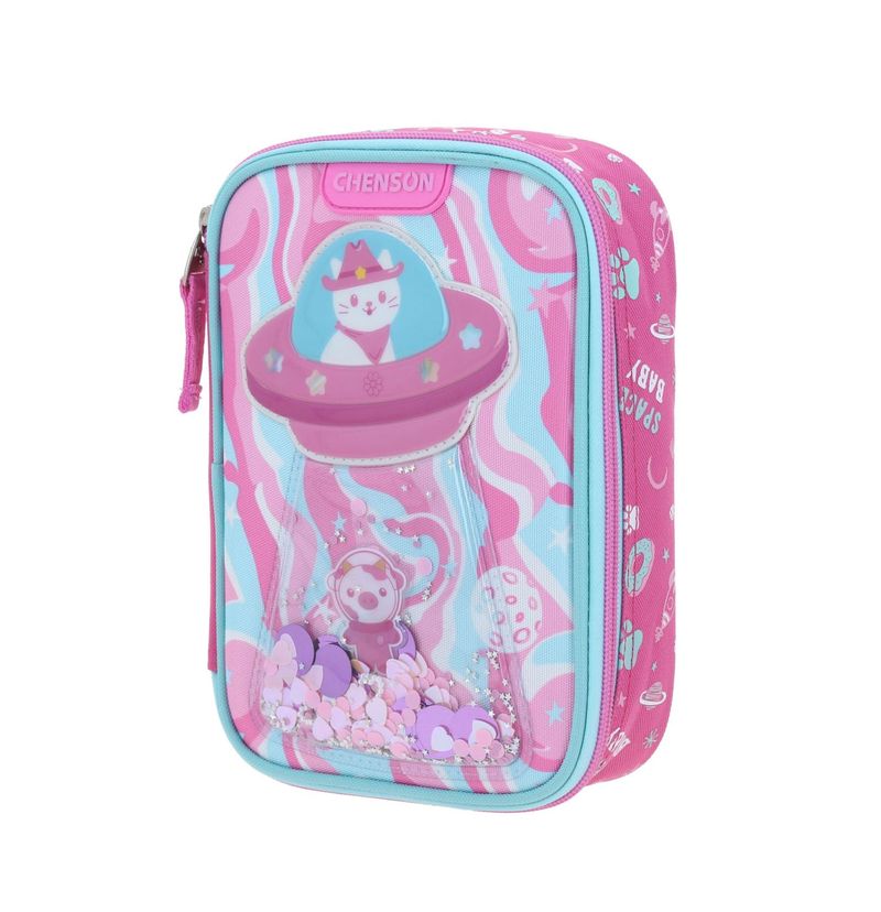 La Lapicera Chenson Gatovaquero HG70159-P es el accesorio escolar más original y adorable para niñas. Presenta un divertido diseño de gatito vaquero dentro de una nave espacial, con fondo en tonos pastel de rosa y azul y detalles líquidos con figuras flotantes. Ideal para llevar con estilo sus lápices y colore